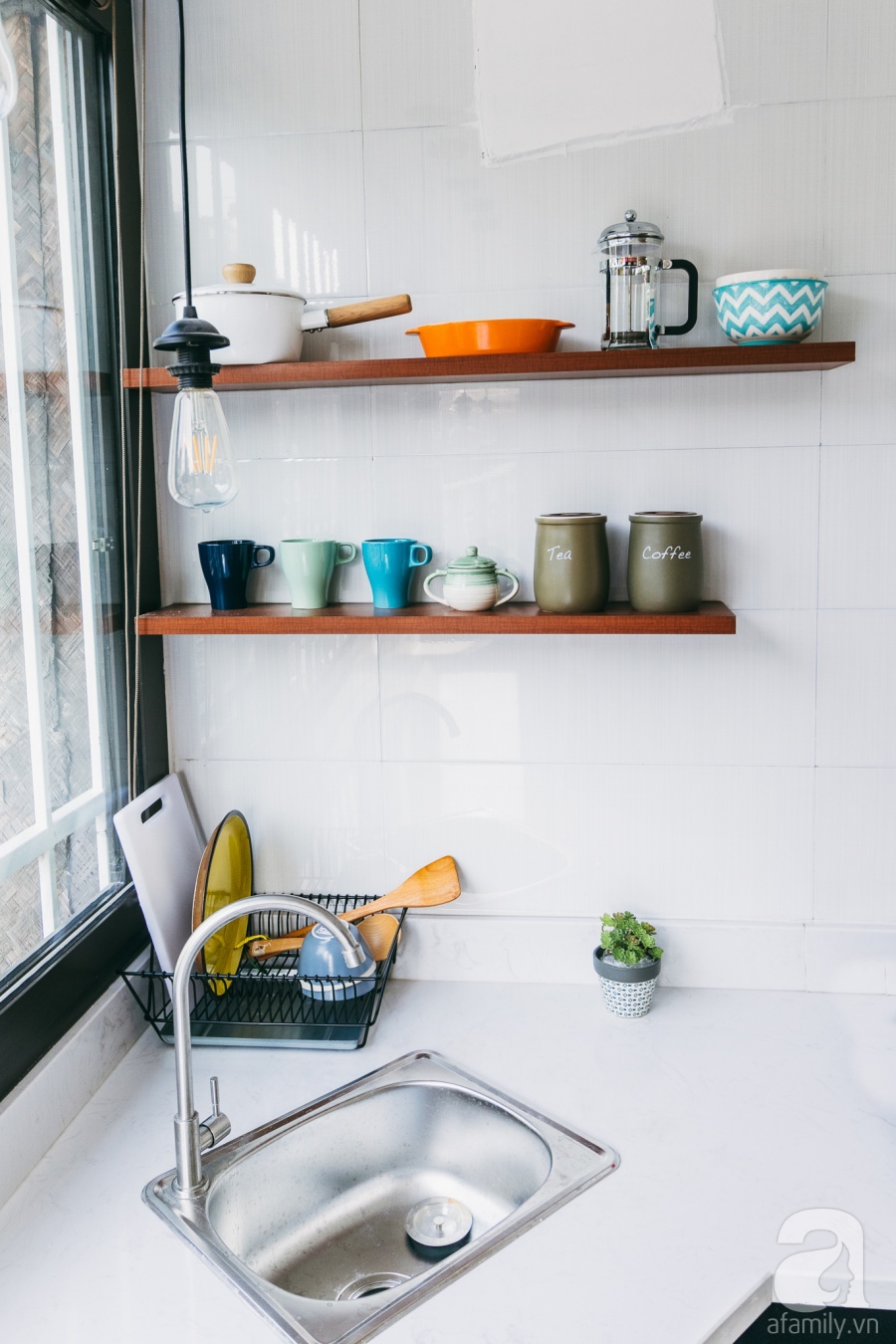 Góc bếp được tận dụng tối đa phần diện tích thừa của căn hộ, được décor gọn xinh với hệ thống tủ đựng đồ phía dưới, kệ phía trên gọn xinh.