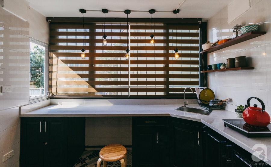 Căn hộ được bố trí vô cùng hợp lý với khoảng diện tích nhỏ gần cửa sổ được thiết kế góc bếp xinh xắn với màu sắc hài hòa, giản dị. Không gian bếp núc đẹp bình yên với điểm nhấn từ gạch hoa ốp sàn. Màu đen và trắng được kết hợp ăn ý mang lại vẻ đẹp ấm cúng và tinh tế cho không gian.