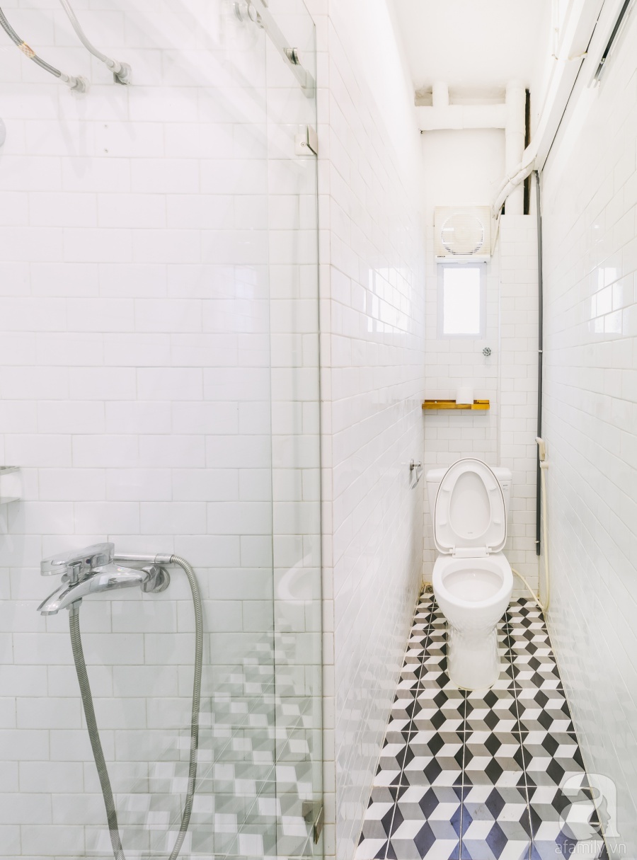 Vì căn phòng có diện tích khá nhỏ nên được anh Võ Duy chọn lựa ốp toàn bộ gạch trắng xung quanh tường, chỉ sử dụng sàn với gạch họa tiết trắng đen đơn giản cho không gian thêm chiều sâu và điểm nhấn nổi bật.