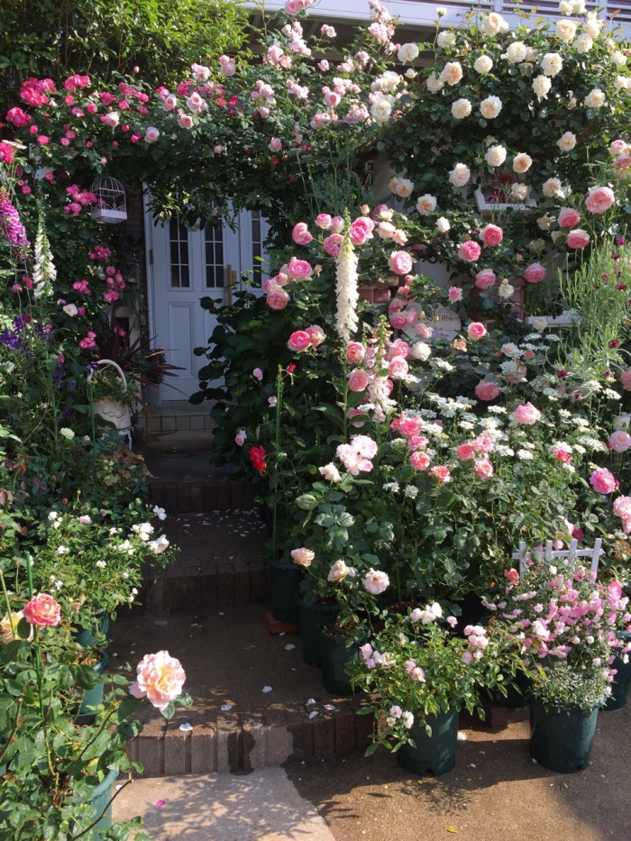 Lối vào vườn không thể ngọt ngào hơn, thơ mộng hơn khi được chào đón bằng những khóm hồng hoa nở trĩu cành.