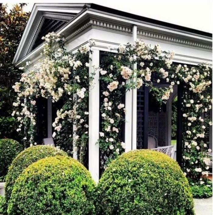 Hồng được trồng leo trên những chiếc cột mái vòm màu trắng, thêm những khóm cây xanh xung quanh để không gian như lặng thinh một vẻ đẹp diệu kỳ.