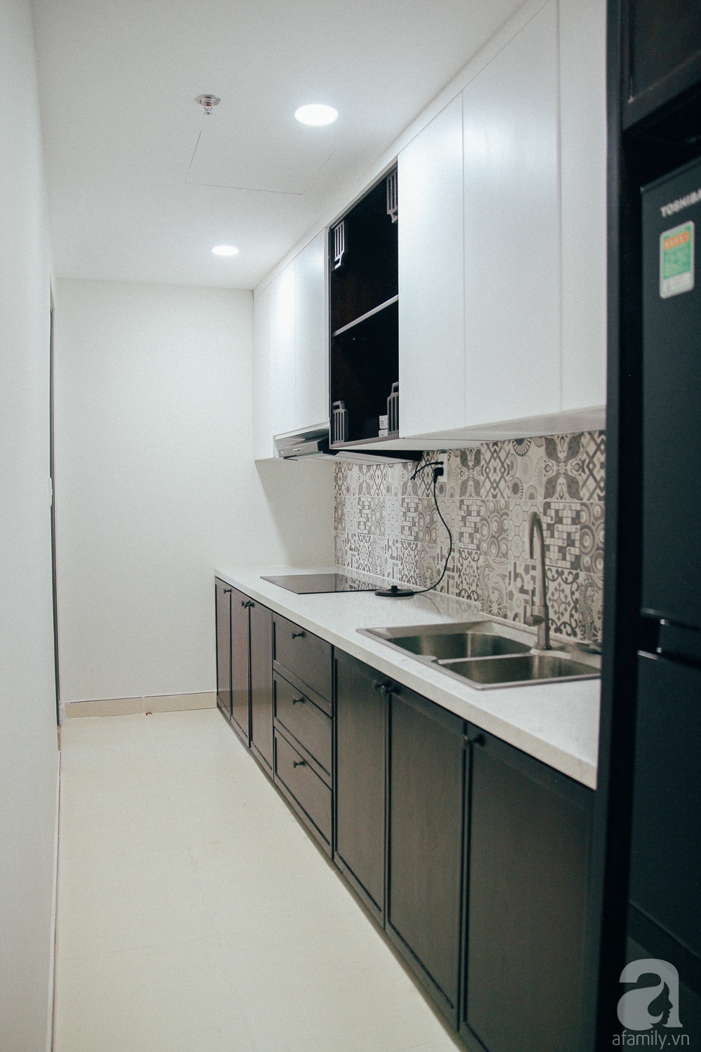 Bên cạnh khu vực phòng ăn là nơi dành riêng cho không gian nấu nướng, riêng tư và tách biêt. Với hai gam màu đối lập, chủ nhân cùng nhà thiết kế đã mang đến cho khu vực bếp nấu của gia đình vẻ đẹp hiện đại và tĩnh lặng. Hệ thống tủ hai màu cơ bản, đối lập với gạch bông ốp tường tạo sự liên kết đặc biệt cho không gian.