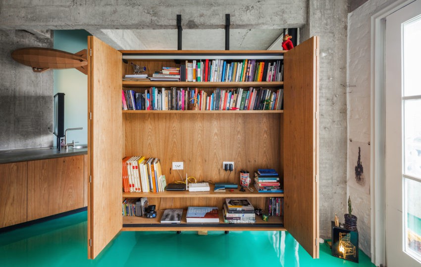 Để tăng cảm giác thoáng đãng trong khu vực nội bộ rộng 46m² , các không gian được phân cách với nhau bởi hệ thống tủ tường gỗ treo lơ lửng trên sàn nhà màu xanh lá cây. Hệ thống này được sử dụng để cải tạo cho cả phòng khách lẫn phòng ngủ. Hệ thống tủ được dùng để lưu trữ một bên để đựng sách và đồ điện tử, phần còn lại là kho lưu trữ quần áo. Các tấm bê tông thực hiện chức năng tổ chức, có vai trò tích hợp các dụng cụ trong nhà bếp và phòng tắm, cách nhau bởi tấm gương.