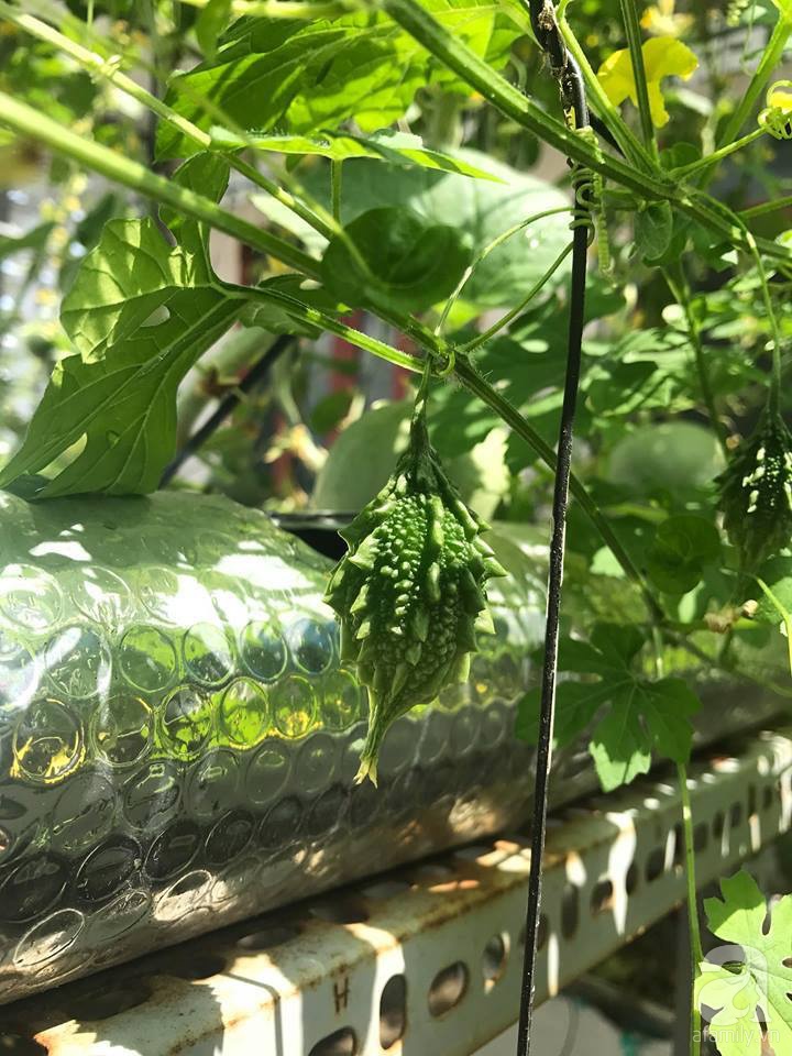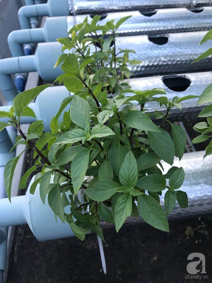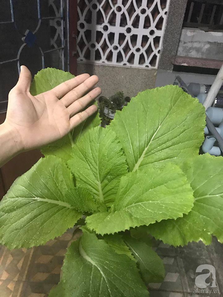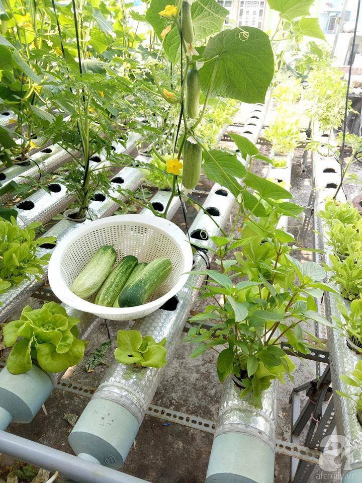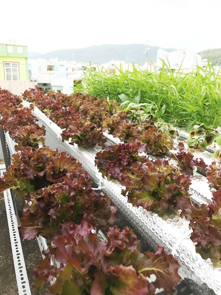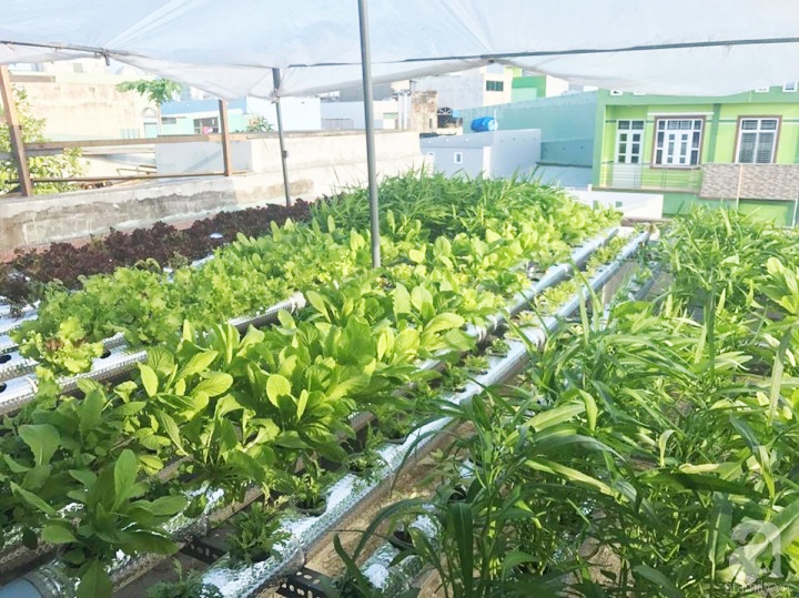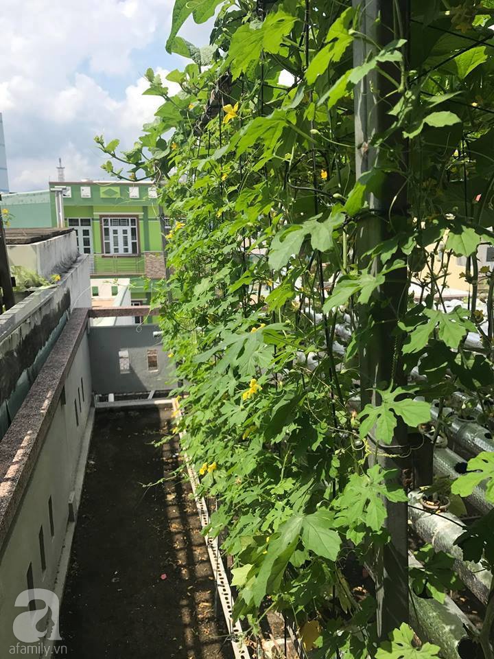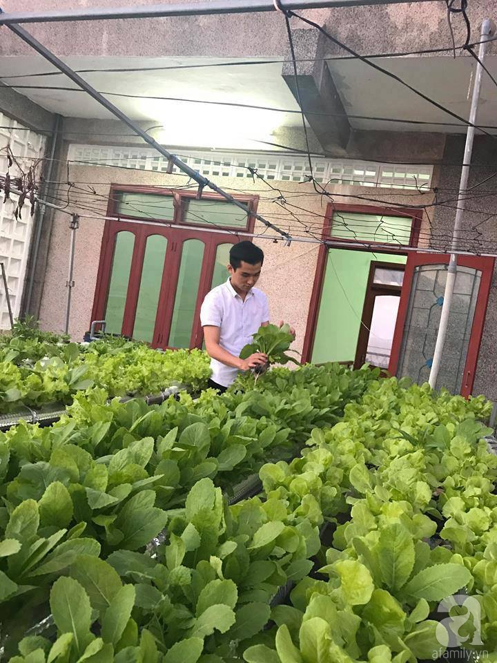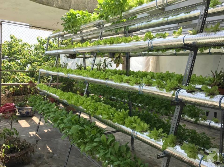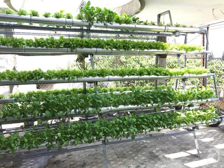 Khoảng sân thượng đủ nắng gió là nơi để chàng sinh viên thỏa sức trồng đủ loại rau quả. Khoảng sân vườn trên cao được anh chàng đặt mẫu vườn chữ A ở tầng 3 và một mẫu vườn rau hàng ngang có diện tích 20m2 ở tầng 4. Cũng nhờ việc nắm bắt nhanh những yêu cầu kỹ thuật cơ bản của mô hình thủy canh, chàng sinh viên thoải mái thời gian khi không mất nhiều công chăm sóc và cũng hạn chế được sâu bệnh hại cây.